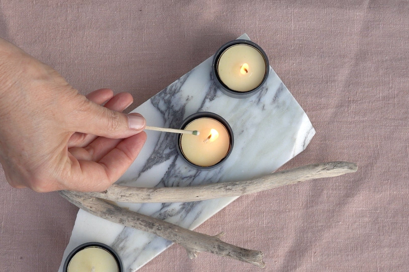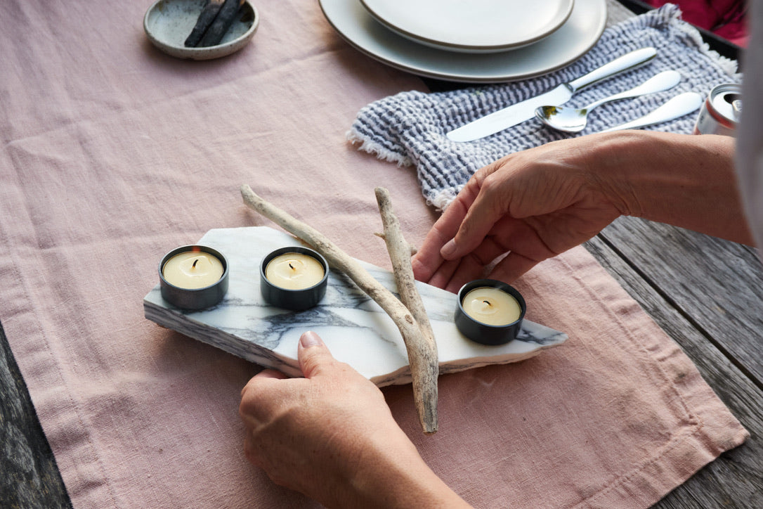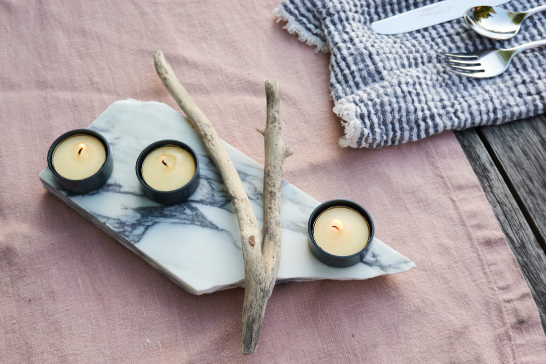 Ah Malibu, 27 miles of scenic beauty. Where the waves crash loudly - or lap gently, depending on the season. In honor of this special place we've selected a piece of sheared marble, to represent the long, craggy coastline, and imbued it with three charcoal-grey tealight candle holders, accompanied by two pieces of real driftwood. Cork pads protect against table scratches. Light the candles, close your eyes and you can almost smell the salt air!