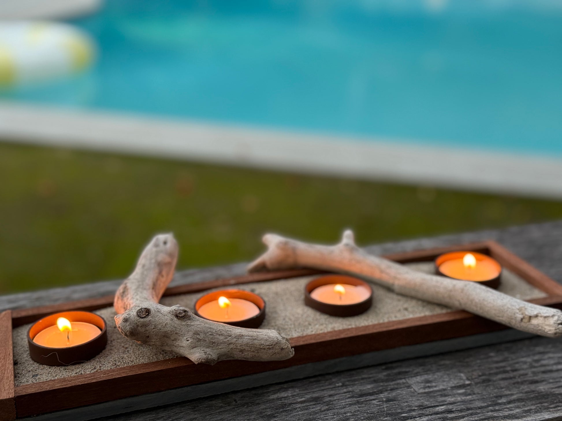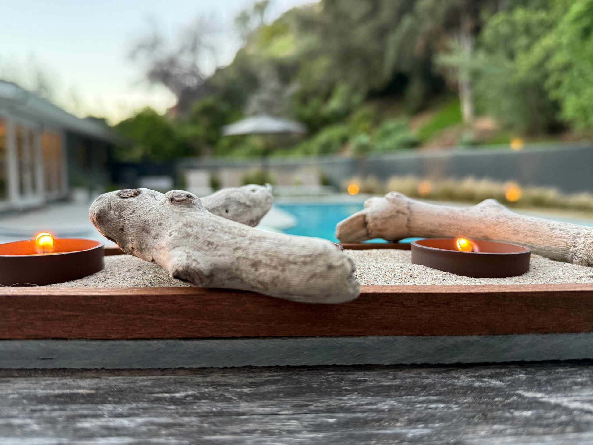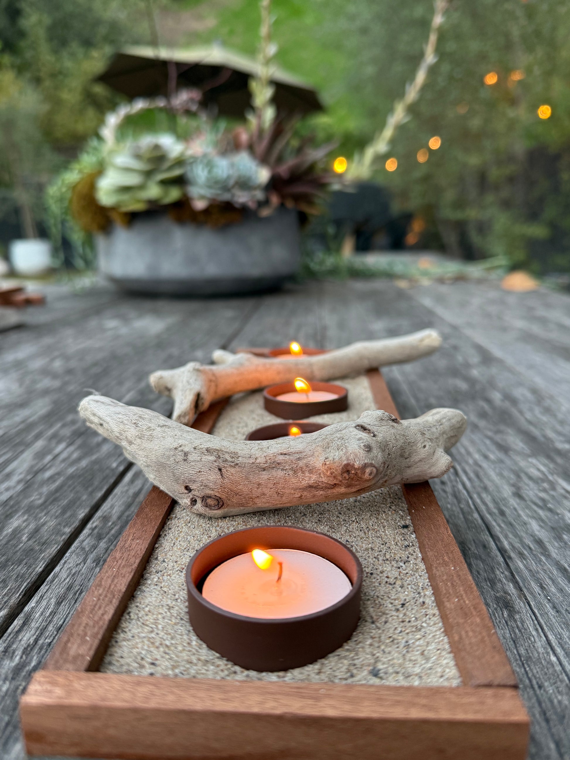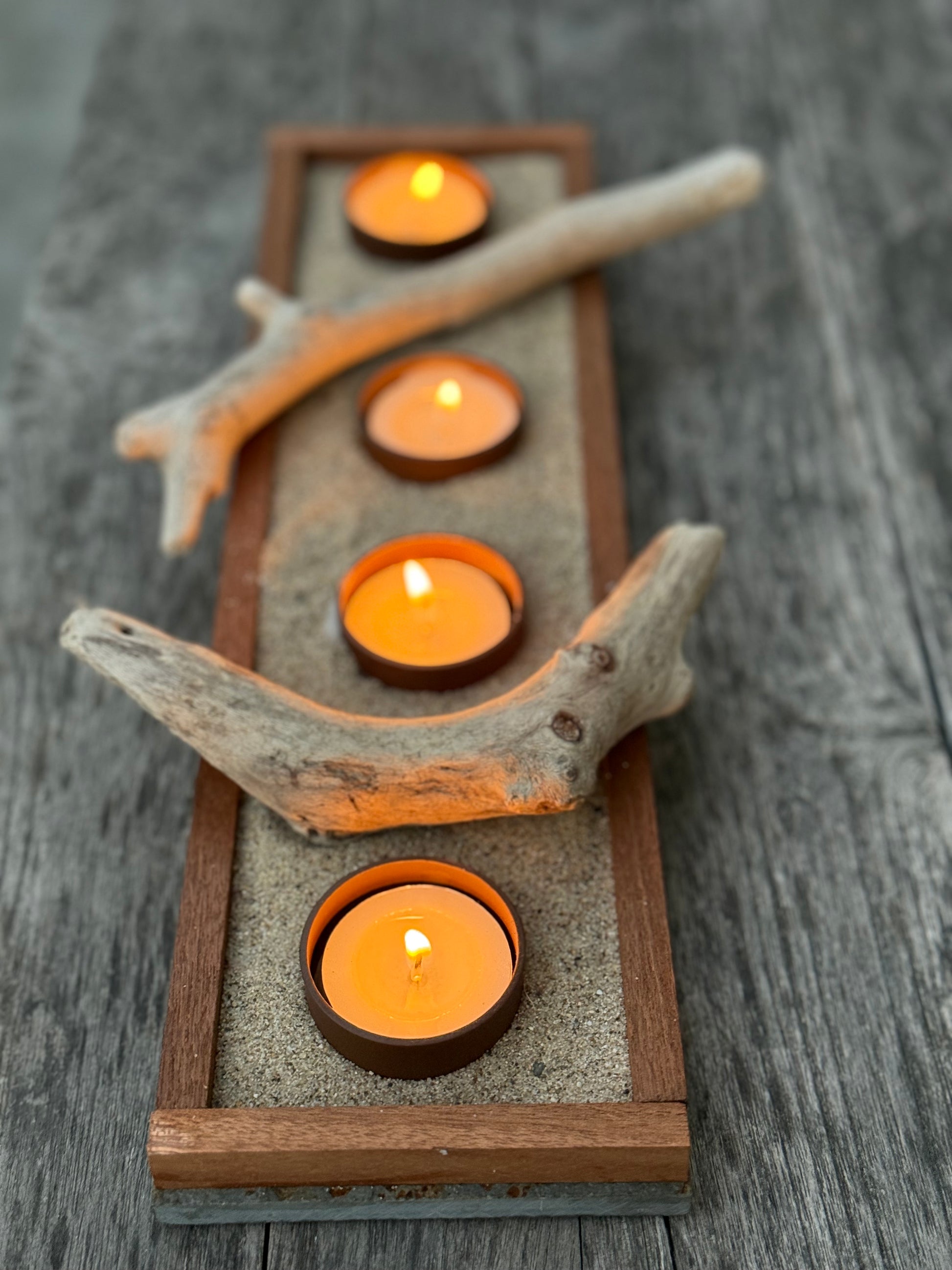 San Diego - home of the first California Mission and the best climate in the world. Meant to evoke the spectacular beaches in the area, “The San Diego” candle sculpture features four tealight candle holders nestled in a bed of real beach sand, intertwined with pieces of real driftwood, all set upon a unique slate base. Cork pads on the bottom protect against table scratches. Set it in your favorite tranquility zone, light the candles, and close your eyes - you can almost hear the sound of the waves lapping up against the sand on a gentle, moonlight night.