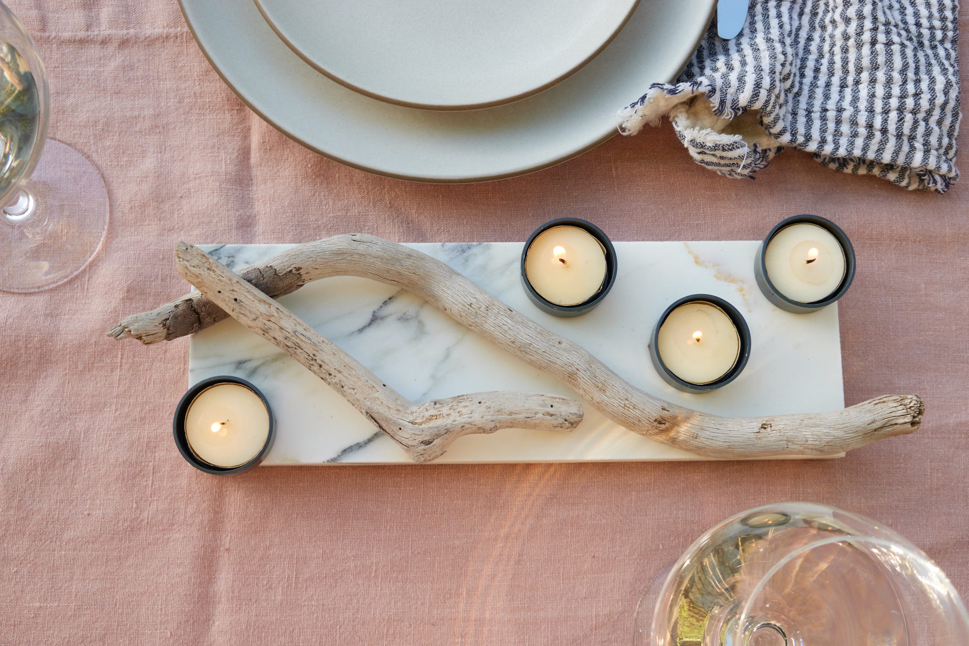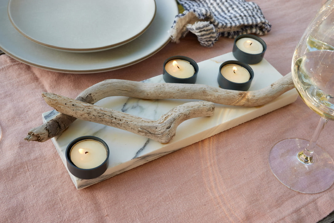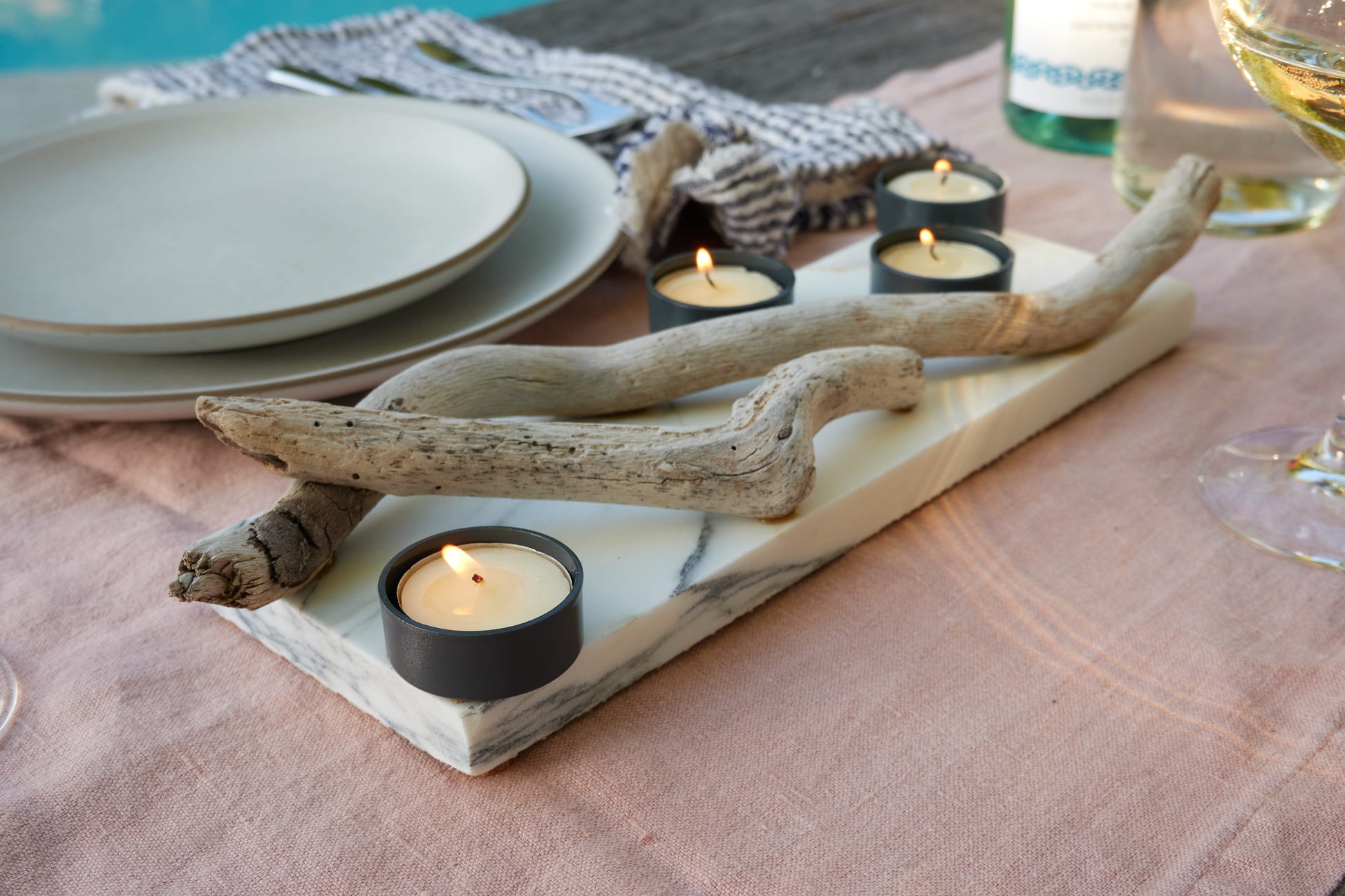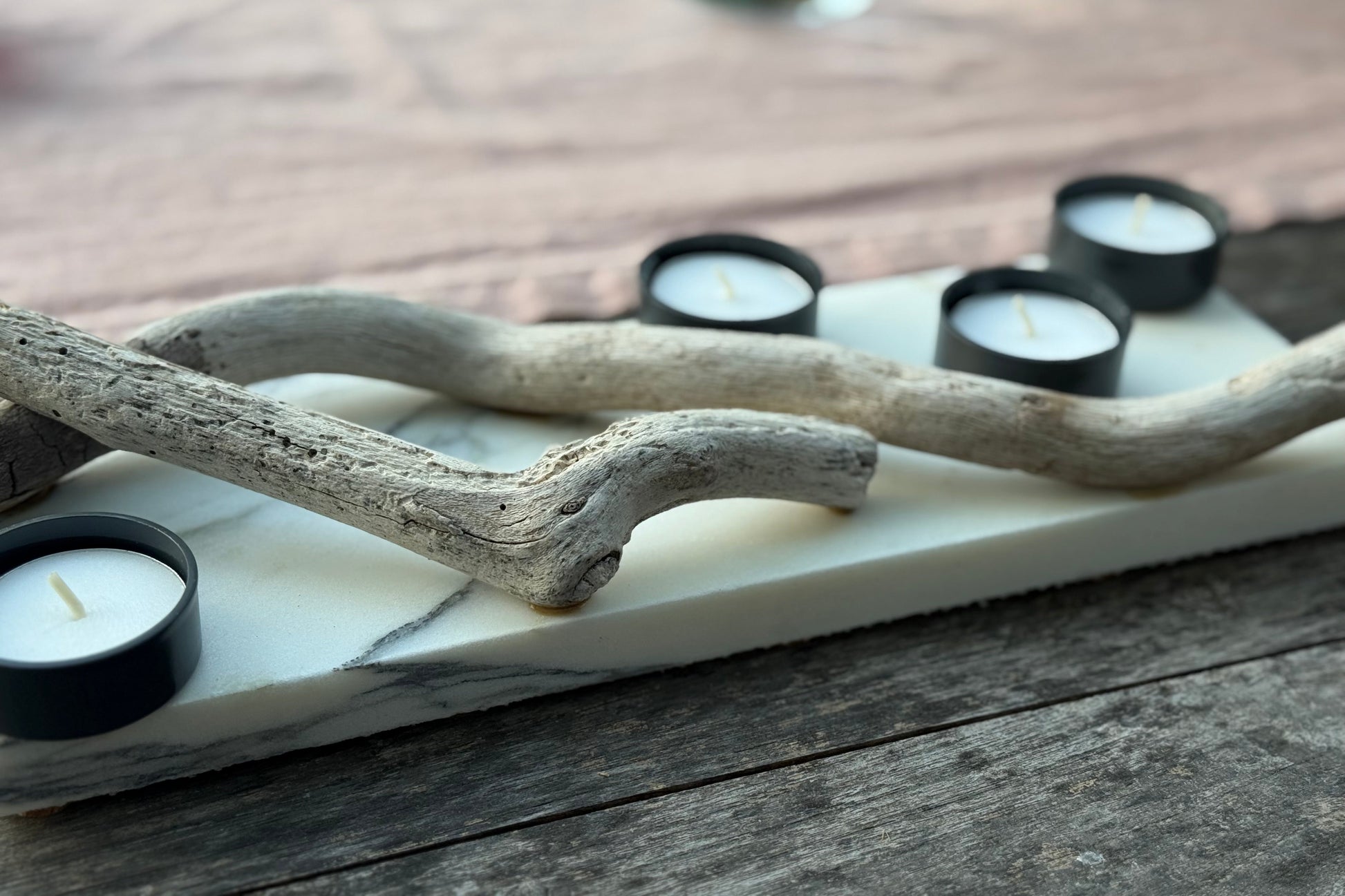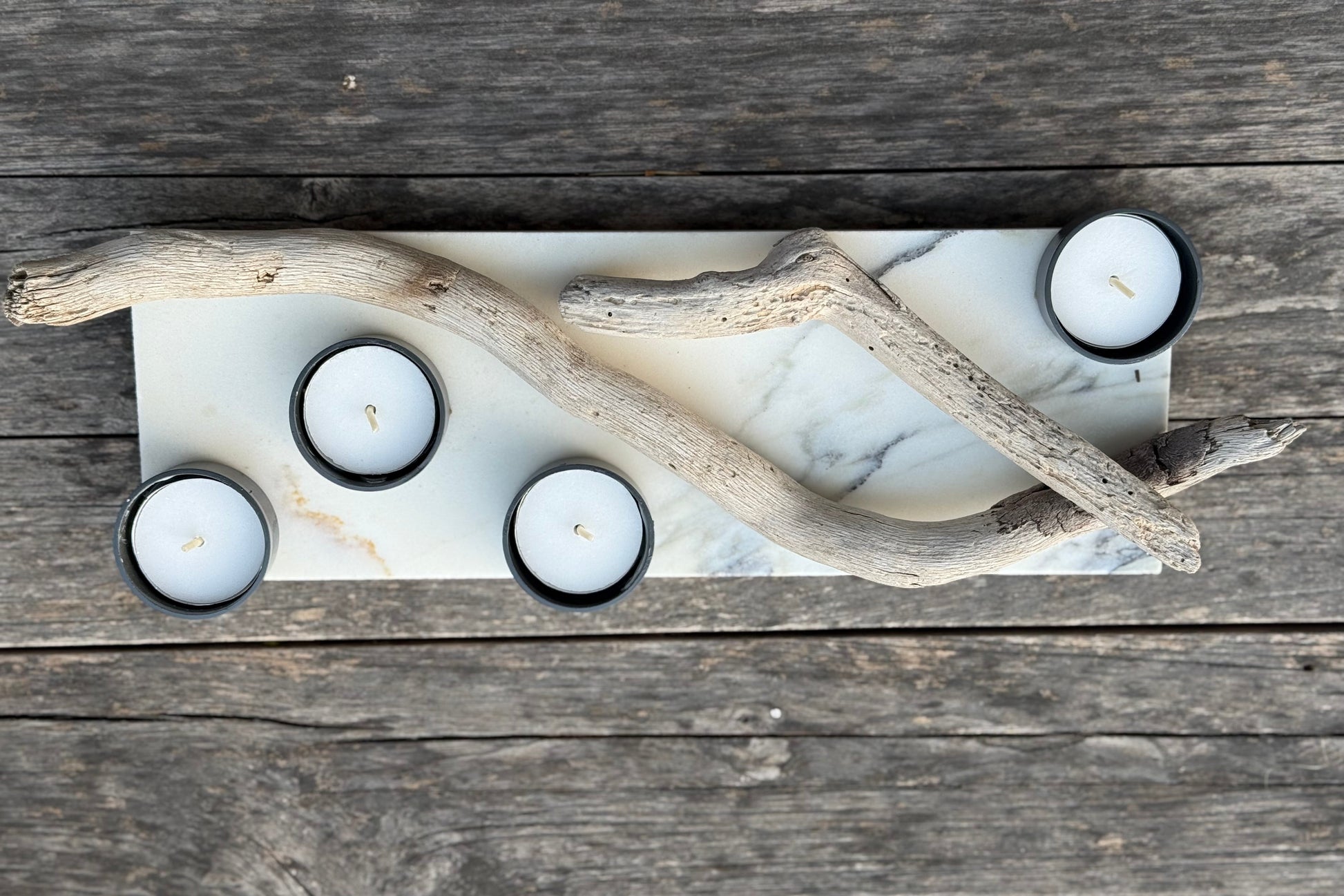 Our premier candle sculpture in the Driftwood Series. Evoking the spirit of the "Queen of the Missions", the Santa Barbara is meant for the discerning customer. Four charcoal-grey tealight candle holders set on gorgeous white marble with beautiful driftwood pieces. Every sculpture is different and unique, yet quintessentially Santa Barbara. A piece worthy of the crown jewel of the Central Coast and the American Riviera - viva Santa Barbara!